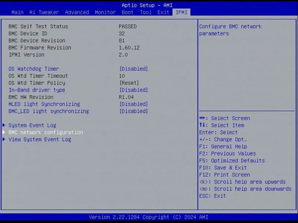 Use the arrow keys to navigate to the ‘Server Management’ section and press enter, then select ‘BMC network configuration’.