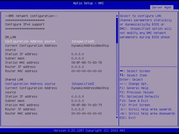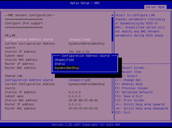 The network configuration can also be done via DHCP, from the drop-down menu select ‘DynamicBmcDhcp’. When the network configuration is done press ‘F10’ to save changes and reset the unit.